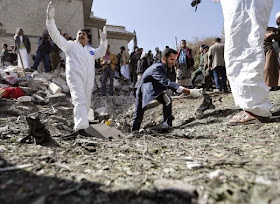 תמונת היום: אנשי זיהוי פלילי בזירת פיצוץ מכונית תופת של אלקאעדה מחוץ לבית השגריר האיראני בתימן אתמול (צילום: רויטרס) |