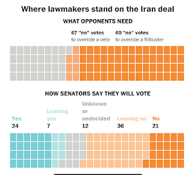 - לאחר שאתמול הצטרף הסנטור הדמוקרטי ה-31 לרשימת המצהירים על תמיכתם בהסכם הגרעין גוברים הסיכויים כי המפלגה הדמוקרטית תשיג את מספר הסנטורים הדרוש כדי למנוע הצבעה על הסכם הגרעין בסנאט. לשם כך, על הדמוקרטים להשיג 41 חברים, ובכך למנוע מהסנאט להצביע נגד הסכם הגרעין ולחסוך מהנשיא אובמה את הצורך להטיל וטו על החלטת הנגד, הנהנית מרוב בשני בתי הקונגרס. בתגובה, נערכים במפלגה הרפובליקנית לקמפיין ציבורי שיגבה מחיר בקרב ציבור הבוחרים מסנטורים דמוקרטיים שיצטרפו למהלך הבלימה ודוברים מטעם המפלגה הרפובליקנית כבר החלו להתבטא בגנות בלימת ההצבעה.