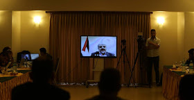 תמונת היום: ח’אלד משעל בראיון סקייפ עם עיתונאים בעזה אתמול (צילום: אתר חמאס)