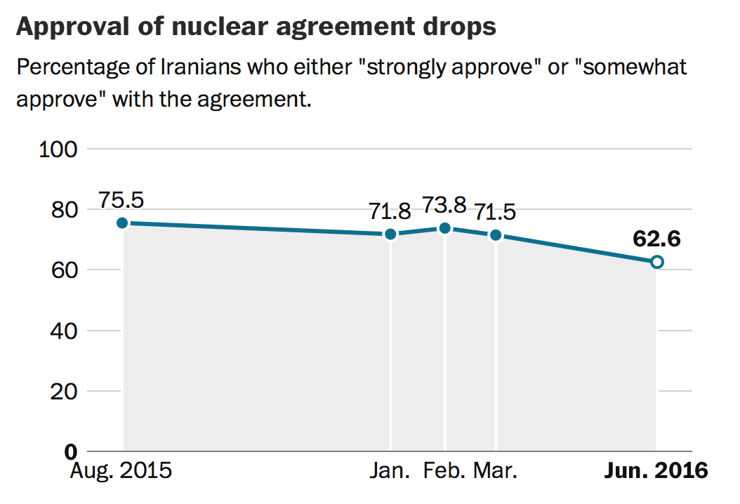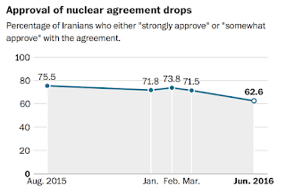 • לקראת מועד השנה לחתימת הסכם הגרעין בין איראן למעצמות, סקר שנערך באיראן מגלה ירידה בתמיכה הציבורית בהסכם. משיעור של 75.5% תמיכה בהסכם (43% תומכים מאד) ירדה התמיכה ל-63% (22% תומכים מאד). 74% מהנסקרים אמרו כי לא חל כל שיפור במצבם הכלכלי וכשלושה רבעים מהנסקרים האשימו את ארה”ב בפעולה מכוונת למניעת שיפור ביחסים הכלכליים בין מדינות העולם לבין איראן.