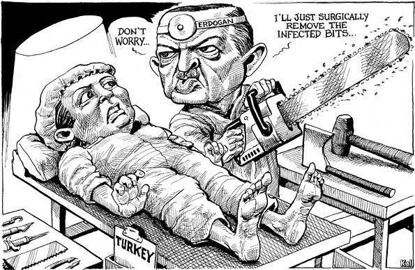 • נמשכים מהלכי הטיהור של ממשלת טורקיה נגד מתנגדי המשטר בחסות ניסיון ההפיכה שהתרחש בשבת. בין היתר נעצרו כ-6000 בני אדם בהם 3000 אנשי צבא בהם יועצו הצבאי של הנשיא ארדואן, 8000 שוטרים הודחו ועוד אלפי פקידים. בנוסף, נסגרו עשרות אתרי חדשות טורקים.
